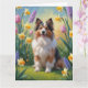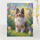 A cheerful dog sits peacefully on lush green grass, surrounded by colorful spring blooms under a soft blue sky. This digital oil painting captures a serene moment with expressive brushstrokes, warm colors, and a sense of gentle joy.
