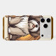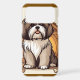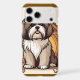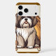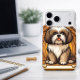 This charming phone case features an adorable brown‑and‑white Shih Tzu sitting proudly in front of a cozy wooden doghouse backdrop. The illustration is playful and detailed, capturing the Shih Tzu’s fluffy coat, expressive eyes, and sweet little tongue peeking out. The circular doghouse opening frames the pup like a spotlight, giving the design a warm, homey feel.