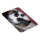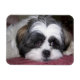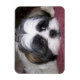 A Cute white and black Shih Tzu dog laying down on a rose / pink blanket. Adorable Shih Tzu Dog Breed Photograph image prints.