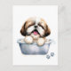 Cute dog watercolor illustration of a happy fluffy Shih Tzu dog in a bathtub. Great for dog lovers.