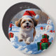 A playful Shih Tzu runs happily through the snowy winter scene, wearing a festive red Christmas hat. This charming design highlights the breed’s flowing coat, sweet expression, and affectionate nature while capturing the warmth and joy of the holiday season. A delightful winter moment full of festive cheer.