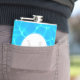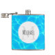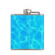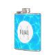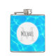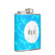 A flask with a photograph of clear blue pool water, with shimmering reflections. A white circle layered over top with a monogram initial and name inside.