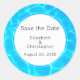 Wedding save the date stickers with a photograph of clear blue pool water, with shimmering reflections. A white circle layered over top with your text inside.