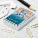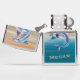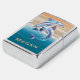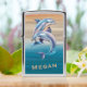Two shimmering dolphins glide through layered ocean‑inspired stripes, rendered in a metallic blue‑purple gradient with space for your personalized name. A bold, beach‑ready design for ocean lovers.