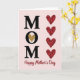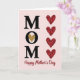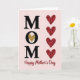 Designed with a soft blush pink background, the front features three tall uppercase letters stacked along the left side, spelling “MOM,” with the center letter replaced by a glittery golden heart that sparkles like a sweet hug ❤️. To the right, four smaller hearts form a neat vertical row, each one a deep ruby red with a shimmering texture that feels like little affectionate notes drifting downward. The dark lettering stands out strongly against the pale backdrop, giving the hearts room to steal the spotlight without looking crowded. Beneath the main design, a flowing line of deep crimson text sits centered near the bottom, reading “Happy Mother’s Day” in a graceful, cursive style 🌼. The mix of gold and red against pink creates a tender, romantic warmth, like a loving glance shared across the room. Everything is arranged with lots of open space, so the message feels calm and easy to read. The final detail is the column of four red glitter hearts aligned on the right, stepping downward in even spacing.