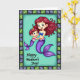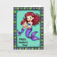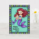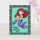 Designed with a tender underwater feel, this card shows two aquatic figures sharing a close embrace, their fingers gently intertwined as if mid-dance ❤️. The larger, adult-like figure has long, flowing auburn hair and bright blue eyes, gazing down with a soft, caring look at the smaller companion. The younger figure has short deep red hair with tiny golden starbursts tucked in, leaning in with rosy cheeks and a cheerful smile that suggests trust and closeness. Both have shimmering purple tails with iridescent scales that fade into elegant fins, catching the light with a subtle glow. Behind them, a calm aquamarine background keeps the scene airy and serene, like clear water lit from above. Along the bottom, the message “Happy Mother’s Day!” sits centered in a dark purple, flowing lettering style that stands out clearly against the pale backdrop 🌼. A geometric border frames the illustration with alternating blue-grey and soft green rectangular shapes around all four edges.