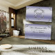 The design features glamorous, ornate silver decorative elements in the center and corners, on a bright shimmering blue background.