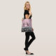 On this stylish tote is a shimmery pink blush metallic brushed sheen where a pink monogram letter and a name is displayed where you can personalize it to make it uniquely your own then below that is a silver band where it transitions to an exotic faux fur black and grey leopard print. Animal chic glam vibes.