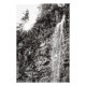 A black and white photograph of a waterfall at a stone wall basin, with trees at the ridge line, and the sun shining at the crest of the landscape scene.