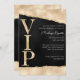 This custom VIP party or event invitation features a glamorous black and gold theme. The background has a black foil gradient pattern in the center, with shiny looking gold foil abstract tears across the top and bottom portion. The VIP title is printed vertically on the left, in a large gold glitter font.