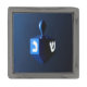 A modernistic, metallic blue dreidel against a dark, night-like background. Two of the Hebrew letters found on a dreidel, nun and shin, glow brightly.