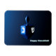 A modernistic, metallic blue dreidel against a dark, night-like background. Two of the Hebrew letters found on a dreidel, nun and shin, glow brightly. Text reading "Happy Hanukkah" also appears in glowing blue and white.