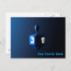 A modernistic, metallic blue dreidel against a dark, night-like background. Two of the Hebrew letters found on a dreidel, nun and shin, glow brightly. Add your own text.