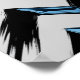 This design features a light gray background intersected by wide, diagonal black brush strokes, creating a sense of motion and flow. Positioned over these strokes are glossy, three-dimensional blue shapes, resembling polished glass or crystal pieces. Each shape aligns with the tilt of the black strokes, enhancing the visual rhythm of the composition. The contrast between the smooth, reflective blue forms and the rough, dynamic edges of the brush strokes creates a striking blend of modernity and energy.