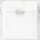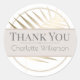 These glamorous stickers feature a simple, classy white background. The sticker is framed with a circular white gold glitter design border. A shiny looking gold, tropical palm leaf is printed across the sticker with a personalized label printed over it. The rectangular text area features a soft beige or tan background color with the phrase "Thank You" printed above a sample name. You can personalize the sticker and add your own name, business name, or custom message or quote.