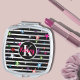 Cute personalized compact mirror design featuring shiny confetti shaped stars in different metallic colors on black and white horizontal stripes and a black circle with silver frame for your text. The text is fully customizable.