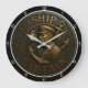 This round wall clock features a detailed, metallic-embossed design of a distinguished ship captain in uniform. A large anchor is prominently displayed in the foreground, with an old sailing ship in the background. Ornate scrollwork frames the scene, with "SHIP CAPTAIN" text. Perfect for maritime enthusiasts or nautical-themed decor.