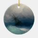 Romantic era oil painting by Ivan Aivazovsky, depicting a lone ship at sea, in stormy weather. With large colorful blue and green waves, and orange light shining through the storm clouds.