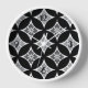 Traditional Japanese Shippo, or "seven treasures" patterned clock of interlocking circles with a central flower motif - flowers in shades of gray / grey with a black and white patterned background