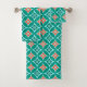 Towel set in a traditional Japanese Shippo, or "seven treasures" patterned of interlocking circles with a central flower motif - flowers in coral orange and teal with a turquoise / peacock and light aqua patterned background