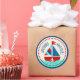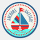 Nautical theme sticker with sailboat and life saver in turquoise, red, navy, blue, and cream.