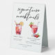 This chic signature mocktails menu table tent sign features custom black typography above 2 non-alcoholic drinks and their ingredients for your wedding bar. A cute Shirley Temple and Virgin Strawberry Daiquiri drawing add a cool flair to your bar menu. Complete with the couple's names and date for their reception.