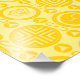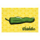 A green shishito chili pepper, also known as kkwari-gochu in Korean, is decorated with patterns inspired by Korean designs and sits on a yellow background with a smaller version of the same pattern and a script label in the corner. This mild pepper is eaten throughout Korea and Japan both raw and cooked.
