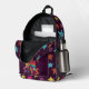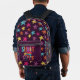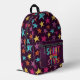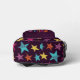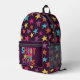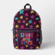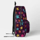 Start your school year off with some positivity. This patterned backpack features the slogan SHOOT FOR THE STARS on the front pocket in bright colored painted style lettering in blue, yellow, orange, pink and lavender against a dark purple background, which coordinates with the bags colorful star pattern.