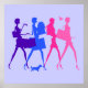 Four silhouettes of women walking in a row with shopping bags and boxes, each in a different color, pink, hot pink, blue and purple.