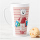 A cute Holiday large latte mug with a cartoon polar bear doing her Christmas shopping on a pink background with red stripes . Personalize it with your name .