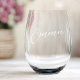Stemless wine glasses with your custom name etched in an elegant calligraphy style script font.