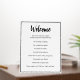 Welcome appears in a black script at the top of this house rules sign for a short-term rental house. A short opening statement is below the script. Then there are eight house rules for a short-term rental house. All of the text is black. All of the text can be changed to reflect the unique rules for your short-term rental property.