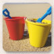 Two sets of brightly colored shovel and pails on a sandy beach.
