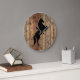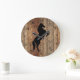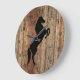 Beautiful simulated wooden back round with a rearing black sihouette stallion, perfect for any horse lover, cabin, barn or feed store!