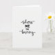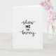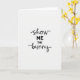 This card features a bright white background with a high-contrast black message that feels like a teasing nudge between close friends or a flirty pair 🐰. The main text reads “show ME THE bunny,” centered and sized to grab attention right away. “show” and “bunny” appear in smooth, flowing lettering with thin strokes that soften the demand and add a gentle, affectionate tone. In the middle, “ME THE” is set in tall, uppercase plain lettering, giving the line a firm beat that makes the joke land. The spacing leaves lots of open white space around the words, like a pause that invites a grin and a quick glance back at the person holding the card 🌷. The mix of soft curves and straight, strong letters creates a push-and-pull that reads like friendly banter. All text stays monochrome, with “ME THE” visually heavier than the surrounding words. The phrase sits centered on the white field, with “ME THE” tucked neatly between the more flowing “show” above and “bunny” below.