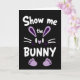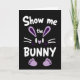 This design shows a deep black background with bright white lettering and soft purple accents arranged to form a cute bunny face 🐰. At the top, the words “Show me” sit in rounded white letters, setting a flirty, friendly tone like a gentle nudge between close companions. A smaller “the” appears centered beneath, tucked between two tall lavender ears with darker purple inner details. Below that, simple white oval eyes and a small light-purple heart nose create a tender, affectionate look 🐇. Thin white whisker lines stretch outward, and two small darker-purple heart shapes sit under the eyes like little blush marks. Near the bottom, “BUNNY” appears in large white letters, giving the layout weight and balance. Two lavender paw prints rest at the base, each with darker purple pads against the black field.