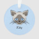 This acrylic ornament features cute graphic artwork on either side depicting the face of a Siamese cat in buff colors, one dark on light and the other light on dark, with pale blue eyes and personalized template text.