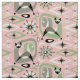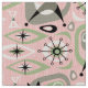 Mid century style abstract Siamese cats, cubes, starbursts, boomerang, lozenges, & more, in mocha, green, light tan, black and a hint of blue on textured pink.