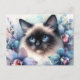 This floral feline postcard features a watercolor painting of a Siamese cat surrounded by beautiful blue and purple orchid flowers, with a pastel background. The blue-eyed kitty is looking off to the side while posed among the blue and purple exotic flowers.