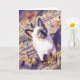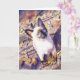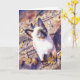 Watercolor painting of Siamese kitten playing in fall leaves.