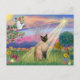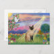 An angel appears in the clouds as the sun breaks through and a rainbow brightens up the sky as an a Chocolate Seal Point Siamese cat sits in the cool grass.