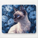 A Siamese cat with striking blue eyes sits amidst a lush garden of blue flowers. The cat's white fur contrasts beautifully with the deep blue hues of the blossoms, creating a visually captivating scene. The cat's gaze is directed towards the right, adding a sense of mystery and intrigue to the image. The background is a blur of blue and green, suggesting a serene and peaceful atmosphere.