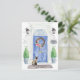 Announce your new address with our stylish announcement featuring a Siamese cat, blue front door, welcome mat, slate sign, topiaries and a floral wreath set on a gray brick background.