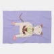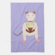 This awesome kitchen towel features a graphic image of a cute Siamese fancy rat with a cream colored body, pink feet and paws, brown ears, nose and tail and little red eyes. The sweet little rat is holding a tasty Birthday cake in its paws. The cake is a chocolate cake topped with pale yellow frosting and filled with red jam. There are nine candles alight on top of the cake.