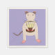 This awesome pack of paper napkins features a graphic image of a cute Siamese fancy rat with a cream colored body, pink feet and paws, brown ears, nose and tail and little red eyes. The sweet little rat is holding a tasty Birthday cake in its paws. The cake is a chocolate cake topped with pale yellow frosting and filled with red jam. There are nine candles alight on top of the cake.