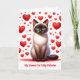 Celebrate the season of love with "Siamese Sweethearts, an illustration that beautifully combines the elegance of the Siamese cat with the romantic vibrancy of Valentine's Day. This design features a front-facing, content Siamese cat sitting gracefully, its striking blue eyes and distinct color points radiating affection and serenity. Surrounded by an abundance of floating red hearts against a deep, contrasting backdrop,