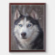 This digital painting depicts a Siberian Husky standing on snow, its fur glistening with frosty highlights as the winter landscape stretches endlessly behind it. The dog’s expressive eyes catch the viewer’s attention.