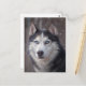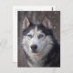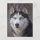 This digital painting depicts a Siberian Husky standing on snow, its fur glistening with frosty highlights as the winter landscape stretches endlessly behind it. The dog’s expressive eyes catch the viewer’s attention.