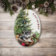 On the front of this Holiday ornament is the image of a beautiful Siberian Husky Dog laying in his wicker basket bed in front of a decorated Christmas tree. Curved red text at the side says "CHRISTMAS". On the back, red and green text says MERRY CHRISTMAS", and there are additional text fields for you to customize to whatever you'd like.