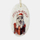 On the front of this Holiday ornament is an image of an adorable Siberian Husky puppy wearing a red and white Santa hat and peeking out of a Christmas gift box. Behind the image is a gold confetti sprinkle background. The text says "Joy to the World". The back of the ornament has the same confetti background and text fields for you to personalize each ornament.